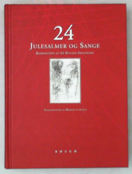 Illustreret sort/hvid. 24 julesalmer og sange. Kobbertryk af 24 ganske grafikere. Indledning til hver salme/sang ved Margrete Auken