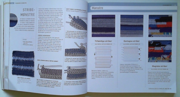 Guide til hækling med mønstre og trin-for-trin tegninger. Vejledning til komplekse mønstre med tekstur, hulmønstre, oldemorfirkanter, påfuglehækling, tunesisk hækling og gimpning