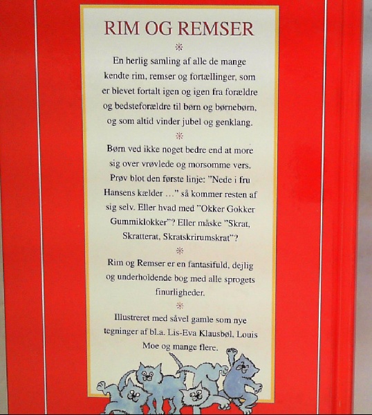 En samling ældre og nyere rim og remser, gækkevers, poesivers, navnevers og andet folkloristisk stof, tematisk inddelt og med gamle og nye illustrationer. Omslagsillustration: Kirsten Raagard