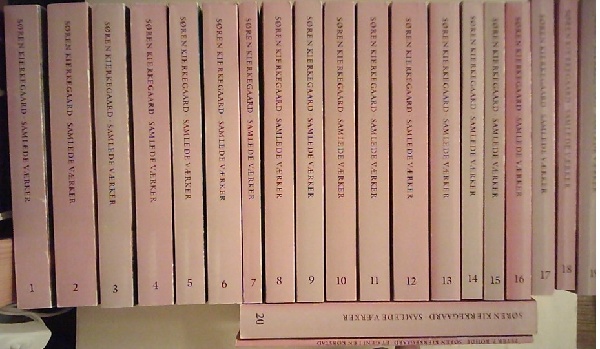 Udgivet af A. B. Drachmann, J. L. Heiberg og H. O. Lange. 1: Af en endnu Levendes Papirer; Om Begrebet Ironi. 2 - 3: Enten-Eller. 4: Atten opbyggelige Taler. 5: Frygt og Bæven; Gjentagelsen; Forord. 6: Philosophiske Smuler; Begrebet Angest; Tre Taler ved tænkte Leiligheder. 7 - 8: Stadier paa Livets Vei. 9 - 10: Afsluttende uvidenskabelig Efterskrift. 11: Opbyggelige Taler i forskjellig Aand. 12: Kjerlighedens Gjerninger. 13: Christelige Taler. 14: En literair Anmeldelse; Krisen og en Krise i en Skuespillerindes Liv; Lilien paa Marken og Fuglen under Himlen; "Ypperstepræsten" - "Tolderen" - "Synderinden". 15: Tvende ethisk-religieuse Smaa-Afhandlinger; Sygdommen til Døden. 16: Indøvelse i Christendom. 17: En opbyggelig Tale; To Taler ved Altergangen om Fredagen; Til Selvprøvelse. Samtiden anbefalet ; Dømmer Selv! 18: Bladartikler, der staar i Forhold til "Forfatterskabet"; Om min Forfatter-Virksomhed; Synspunktet for min Forfatter-Virksomhed. 19: Bladartikler 1854-55; Øieblikket 1-10; Hvad Christus dømmer om officiel Christendom; Guds Uforanderlighed. 20: Terminologisk Ordbog ved Jens Himmelstrup. Sammenlignende Register til første anden og nærværende udgave af Samlede Værker.