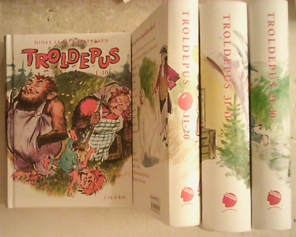 Alle 41 historier samlet i 4 bind om troldebarnet Troldepus, der bor i Troldhøj med sin far, mor og lillesøster, og som laver mange narrestreger. Illustreret af Karl Tornby.